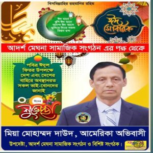 আদর্শ মেঘনা সামাজিক সংগঠনের সম্মানিত উপদেষ্টা ও (আমেরিকা অভিবাসী) মিয়া মোহাম্মদ দাউদ এর পক্ষ মেঘনাবাসীকে পবিত্র ঈদুল ফিতরের শুভেচ্ছা ও অভিনন্দন