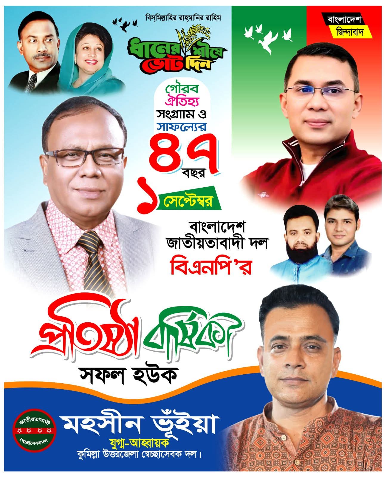 গণতন্ত্র, বাকস্বাধীনতা রক্ষা ও দুর্নীতিমুক্ত বাংলাদেশ গড়তে কাজ করবে বাংলাদেশ জাতীয়তাবাদী দল (বিএনপি), বিএনপি এর ৪৭তম প্রতিষ্ঠাবার্ষিকী উপলক্ষে কুমিল্লা জেলা মেঘনা উপজেলার সকলকে শুভেচ্ছা ও অভিনন্দন জানিয়েছেন কুমিল্লা উওর জেলা স্বেচ্ছাসেবক দলের যুগ্ম-আহ্বায়ক মোঃ মহসীন ভূঁইয়া।