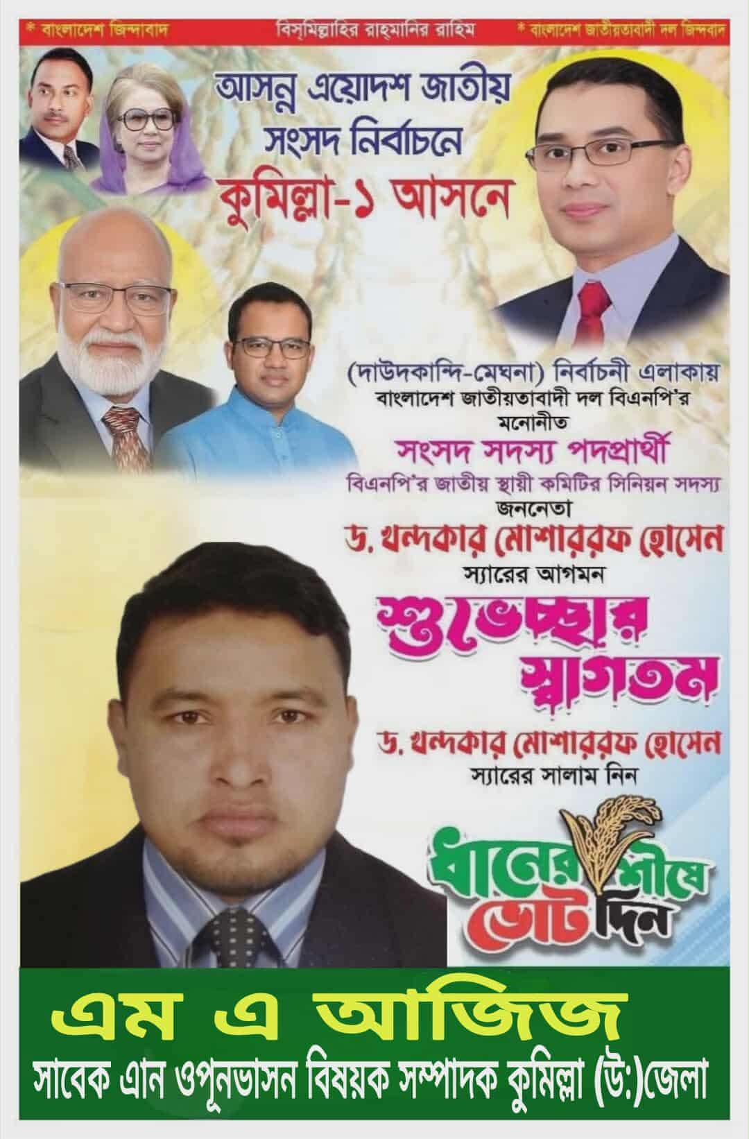 মোঃ নাজিম উদ্দিন, নিজস্ব প্রতিবেদকঃ- আসন্ন এয়োদশ জাতীয় সংসদ নির্বাচনে কুমিল্লা-১ (দাউদকান্দি -মেঘনা) নির্বাচনী এলাকায় বাংলাদেশ জাতীয়তাবাদী দল বিএনপির মনোনীত ধানের শীষের সংসদ সদস্য (এমপি) পদ-প্রার্থী বিএনপি'র স্থানীয় কমিটির সিনিয়র সদস্য, তিন বারের সাবেক সফল মন্ত্রী ও বীর মুক্তিযোদ্ধা জননন্দিত নেতা ড.খন্দকার মোশাররফ হোসেন এর নেতৃত্বে আগামীকাল ২৯ নভেম্বর ২০২৫ইং (শনিবার) বিকালে মেঘনা উপজেলার মানিকারচর এল এল উচ্চ বিদ্যায় মাঠে ঐতিহাসিক গণ-মিছিল অনুষ্ঠানে ড.খন্দকার মোশাররফ হোসেন কুমিল্লা থেকে মেঘনায় আগমন উপলক্ষ্যে মেঘনা উপজেলা বিএনপির সাবেক আহ্বায়ক ও কুমিল্লা উঃ জেলা বিএনপির সাবেক যুগ্ম-আহ্বায়ক মোঃ রমিজ উদ্দিন (লন্ডনী) পক্ষ থেকে এবং কুমিল্লা উওর জেলা বিএনপি'র সাবেক এান ও পূর্ণবাসন বিষয়ক সম্পাদক, বর্তমানে মেঘনা থানা যুবদলের সম্মানিত সদস্য এবং আমেরিকা প্রবাসী এম এ আজিজ এর পক্ষ থেকে স্বাগতম, আন্তরিক শুভেচ্ছা ও অভিনন্দন জানান।